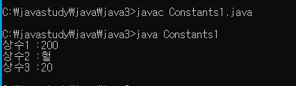 class Constants1 { public static void main(String[] args) { final int AA = 200; final char BB = '헐'; final int CC; CC = 20; System.out.println("상수1 :" + AA); System.out.println("상수2 :" + BB); System.out.println("상수3 :" + CC); } }결과