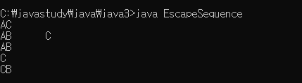 class EscapeSquence { public static void main(String[] args) { System.out.println("AB" + '\b' + 'C'); System.out.println("AB" + '\t' + 'C'); System.out.println("AB" + '\n' + 'C'); System.out.println("AB" + '\r' + 'C'); } }결과