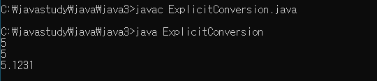 class ExplicitConversion{ public static void main(String[] args) { double a = 5.1231; int num1 = (int)a; System.out.println(num1); System.out.println((int)a); System.out.println(a); } }결과