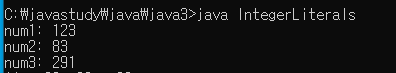class IntegerLiterals { public static void main(String[] args) { int num1 = 123; //10진수 표현 int num2 = 0123; //8진수 표현 int num3 = 0x123; //16진수 표현 System.out.println("num1: " + num1); System.out.println("num2: " + num2); System.out.println("num3: " + num3); } }결과