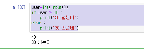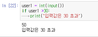 user1 = int(input()) if user1 >30: print("입력값은 30 초과")입력값이 30이상이면 출력하기!