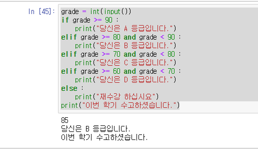 grade = int(input()) if grade >= 90 : print("당신은 A 등급입니다.") elif grade >= 80 and grade < 90 : print("당신은 B 등급입니다.") elif grade >= 70 and grade < 80 : print("당신은 C 등급입니다.") elif grade >= 60 and grade < 70 : print("당신은 D 등급입니다.") else : print("재수강 하십시요") print("이번 학기 수고하셨습니다.")