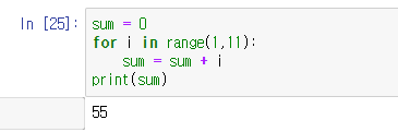 sum = 0 for i in range(1,11): sum = sum + i print(sum)