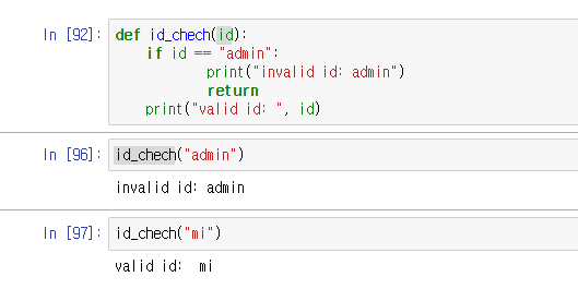 def id_chech(id): if id == "admin": print("invalid id: admin") return print("valid id: ", id)