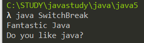 class SwitchBreak{ public static void main(String[] args){ int n = 3; switch(n){ case 1: System.out.println("Simple Java"); break; case 2: System.out.println("Funny Java"); break; case 3: System.out.println("Fantastic Java"); break; default: System.out.println("The best programming language"); } System.out.println("Do you like java?"); } }