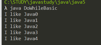 class DoWhileBasic{ public static void main(String[] args){ int num = 0; do { System.out.println("I like Java" + num); num++; }while(num<5); } }결과