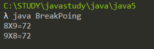 class LabeledBreakPoing{ public static void main(String[] args){ outer: for(int i=1; i<10;i++){ for(int j=1;j<10;j++){ if((i*j)==72){ System.out.println(i+"X"+j+"="+i*j); break outer; } } } } }