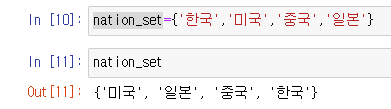 변수명 = set() 또는 변수명 ={데이터1,데이터2}(딕셔너리하고 같기때문에 set() 을 더 많이 사용한다.),변수명 = set(데이터1), 변수명 = set({데이터1, 데이터2, ...})