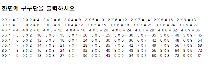 <%@ page language="java" contentType="text/html; charset=EUC-KR" pageEncoding="EUC-KR"%> <!DOCTYPE html> <html> <head> <meta charset="EUC-KR"> <title>Insert title here</title> </head> <body> <h2>화면에 구구단을 출력하시오</h2> <% for(int i=2;i<10;i++){ for(int j=1;j<10;j++){ %> <%= i%> X <%=j %> = <%=i*j%> <% } %> <br> <% } %> </body> </html>