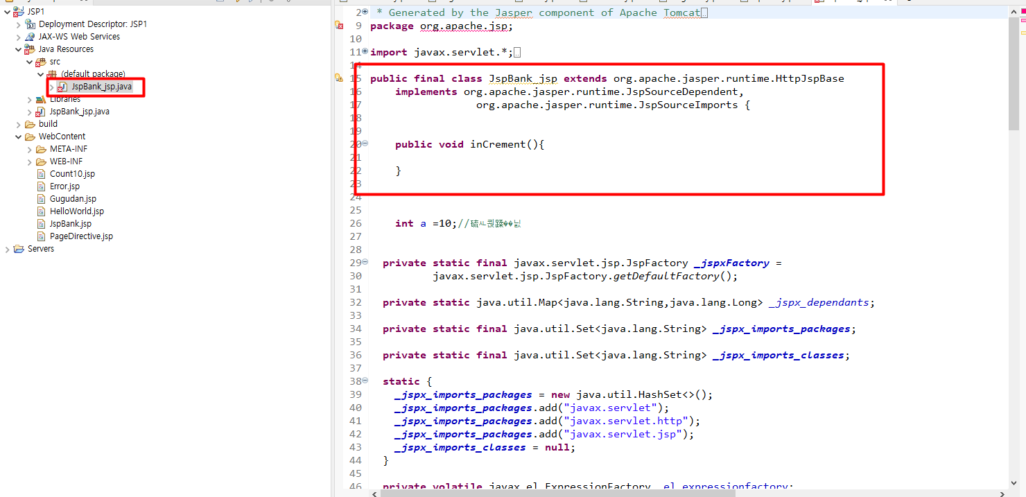 <%@ page language="java" contentType="text/html; charset=EUC-KR" pageEncoding="EUC-KR"%> <!DOCTYPE html> <html> <head> <meta charset="EUC-KR"> <title>Insert title here</title> </head> <body> <h2>화면에 구구단을 출력하시오</h2> <% for(int i=2;i<10;i++){ for(int j=1;j<10;j++){ out.write(i + "*" + j + "=" + i*j); } } %> </body> </html><%@ page language="java" contentType="text/html; charset=EUC-KR" pageEncoding="EUC-KR"%> <!DOCTYPE html> <html> <head> <meta charset="EUC-KR"> <title>Insert title here</title> </head> <body> <%! public void inCrement(){ } %> <%! int a =10;//멤버변수 %> <% int a=100;//지역변수 %> </body> </html><!% %> 선언문 멤버변수(보통은 외부에 자바 class 를 만들고 그 메소드를 호출하는 방법을 많이 쓴다)