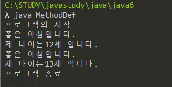 class MethodDef{ public static void main(String[] args){ System.out.println("프로그램의 시작"); hiEveryone(12); hiEveryone(13); System.out.println("프로그램 종료"); } public static void hiEveryone(int age){ System.out.println("좋은 아침입니다."); System.out.println("제 나이는" + age + "세 입니다."); } }main 메소드 안의