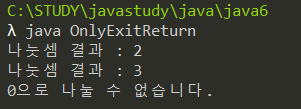 class OnlyExitReturn{ public static void main(String[] args){ divide(4,2); divide(6,2); divide(9,0); } public static void divide(int num1, int num2){ if(num2 == 0){ System.out.println("0으로 나눌 수 없습니다."); return; //값의 반환 없이 메소드만 종료 } System.out.println("나눗셈 결과 : " + (num1/num2)); } }위에서 보듯이 return은 메소드의 마지막이 아닌 중간에서 등장할 수도 있다.