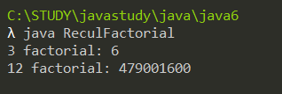 class ReculFactorial{ public static void main(String[] args){ System.out.println("3 factorial: " + factorial(3)); System.out.println("12 factorial: " + factorial(12)); } public static int factorial(int n){ if(n ==1) return 1; else return n * factorial(n-1); } }