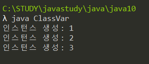 class InstCnt{ static int instNum = 0; //클래스 변수 InstCnt(){ //생성자 instNum++; //static 으로 선언된 변수의 값 증가 System.out.println("인스턴스 생성: " + instNum); } } class ClassVar{ public static void main(String[] args){ InstCnt cnt1 = new InstCnt(); InstCnt cnt2 = new InstCnt(); InstCnt cnt3 = new InstCnt(); } }결과