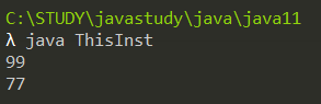 class SimpleBox{ private int data; SimpleBox(int data){ this.data = data; } void setData(int data){ this.data = data; } int getData(){ return this.data; } } class ThisInst{ public static void main(String[] args){ SimpleBox box = new SimpleBox(99); System.out.println(box.getData()); box.setData(77); System.out.println(box.getData()); } }