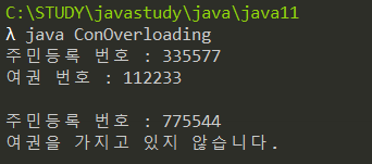 class Person{ private int regiNum; //주민등록 번호 private int passNum; //여권 번호 Person(int rnum, int pnum){ regiNum = rnum; passNum = pnum; } Person(int rnum){ //주민번호는 있지만 여권번호는 없는 경우 regiNum = rnum; passNum = 0; } void showPersonalInfo(){ System.out.println("주민등록 번호 : " + regiNum); if(passNum != 0) System.out.println("여권 번호 : " + passNum + "\n"); else System.out.println("여권을 가지고 있지 않습니다. \n"); } } class ConOverloading{ public static void main(String[] args){ //여권 있는 사람의 정보를 담은 인스턴스 생성 Person jung = new Person(335577,112233); //여권 없는 사람의 정보를 담은 인스턴스 생성 Person hong = new Person(775544); jung.showPersonalInfo(); hong.showPersonalInfo(); } }결과