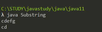 class Substring{ public static void main(String[] args){ String st1 = "abcdefg"; String st2 = st1.substring(2); System.out.println(st2); String st3 = st1.substring(2,4); System.out.println(st3); } }
