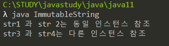class ImmutableString{ public static void main(String[] args){ String str1 = "Simple String"; String str2 = "Simple String"; String str3 = new String("Simple String"); String str4 = new String("Simple String"); if(str1 == str2) System.out.println("str1 과 str 2는 동일 인스턴스 참조"); else System.out.println("str1 과 str2는 다른 인스턴스 참조"); if(str3 == str4) System.out.println("str3 과 str 4는 동일 인스턴스 참조"); else System.out.println("str3 과 str4는 다른 인스턴스 참조"); } }