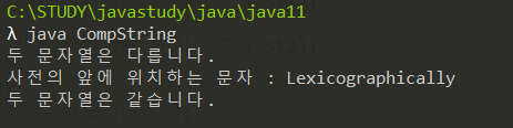 class CompString{ public static void main(String[] args){ String st1 = "Lexicographically"; String st2 = "lexicographically"; int cmp; if(st1.equals(st2)) System.out.println("두 문자열은 같습니다."); else System.out.println("두 문자열은 다릅니다."); cmp = st1.compareTo(st2); if(cmp ==0) System.out.println("두 문자열은 일치합니다. "); else if (cmp < 0) System.out.println("사전의 앞에 위치하는 문자 : " + st1); else System.out.println("사전의 앞에 위치하는 문자 : " + st2); if(st1.compareToIgnoreCase(st2)==0) System.out.println("두 문자열은 같습니다. "); else System.out.println("두 문자열은 다릅니다. "); } }
