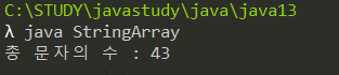 class StringArray{ public static void main(String[] args){ String[] ar = new String[7]; ar[0] = new String("Java"); ar[1] = new String("System"); ar[2] = new String("Compiler"); ar[3] = new String("Park"); ar[4] = new String("Tree"); ar[5] = new String("Dinner"); ar[6] = new String("Brunch Cafe"); int cnum = 0; for(int i = 0; i < ar.length; i++) cnum += ar[i].length(); System.out.println("총 문자의 수 : " + cnum); } }