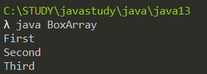 class Box{ private String conts; Box(String cont){ this.conts = cont; } public String toString(){ return conts; } } class BoxArray{ public static void main(String[] args){ Box[] ar = new Box[3]; //배열에 인스턴스 저장 ar[0] = new Box("First"); ar[1] = new Box("Second"); ar[2] = new Box("Third"); //저장된 인스턴스의 참조 System.out.println(ar[0]); System.out.println(ar[1]); System.out.println(ar[2]); } }