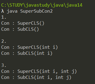 class SuperCLS{ public SuperCLS(){ System.out.println("Con : SuperCLS()"); } public SuperCLS(int i){ System.out.println("Con : SuperCLS(int i)"); } public SuperCLS(int i, int j){ System.out.println("Con : SuperCLS(int i, int j)"); } } class SubCLS extends SuperCLS{ public SubCLS(){ System.out.println("Con : SubCLS()"); } public SubCLS(int i){ super(i); //상위 클래스의 생성자를 지정 및 호출 System.out.println("Con : SubCLS(int i)"); } public SubCLS(int i, int j){ super(i, j); //상위 클래스의 생성자 지정 및 호출 System.out.println("Con : SubCLS(int i, int j)"); } } class SuperSubCon2{ public static void main(String[] args){ System.out.println("1. "); new SubCLS(); System.out.println(); System.out.println("2. "); new SubCLS(1); System.out.println(); System.out.println("3. "); new SubCLS(1,2); System.out.println(); } }