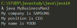 class Man{ String name; public Man(String name){ this.name = name; } public void tellYourName(){ System.out.println("My name is " + name); } } class BusinessMan extends Man{ String company; String position; public BusinessMan(String name, String company, String position){ super(name); this.company = company; this.position = position; } public void tellYourInfo(){ System.out.println("My company is " + company); System.out.println("My position is " + position); tellYourName(); } } class MyBusinessMan2{ public static void main(String[] args){ BusinessMan man = new BusinessMan("YOON", "SAMSUNG","CEO"); man.tellYourInfo(); } }