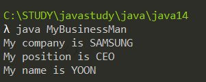 class Man{ String name; public void tellYourName(){ System.out.println("My name is " + name); } } class BusinessMan extends Man{ String company; String position; public BusinessMan(String name, String company, String position){ //상위클래스 Man의 멤버 초기화 this.name = name; //클래스 BusinessMan 의 멤버 초기화 this.company = company; this.position = position; } public void tellYourInfo(){ System.out.println("My company is " + company); System.out.println("My position is " + position); tellYourName(); } } class MyBusinessMan{ public static void main(String[] args){ BusinessMan man = new BusinessMan("YOON", "SAMSUNG", "CEO"); man.tellYourInfo(); } }