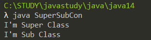 class SuperCLS{ public SuperCLS(){ //생성자 System.out.println("I'm Super Class"); } } class SubCLS extends SuperCLS{ public SubCLS(){ //생성자 System.out.println("I'm Sub Class"); } } class SuperSubCon{ public static void main(String[] args){ new SubCLS(); } }