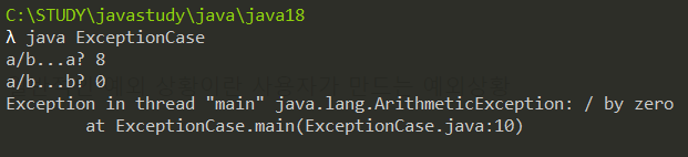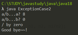 import java.util.Scanner; class ExceptionCase{ public static void main(String[] args){ Scanner kb = new Scanner(System.in); System.out.print("a/b...a? "); int n1 = kb.nextInt(); System.out.print("a/b...b? "); int n2 = kb.nextInt(); System.out.printf("%d / %d = %d \n", n1, n2, n1/n2); System.out.println("Good bye~~!"); } }
