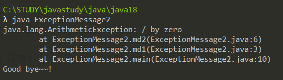 class ExceptionMessage2 { public static void md1(int n) { md2(n, 0); } public static void md2(int n1, int n2) { int r = n1 / n2; } public static void main(String[] args) { try { md1(3); } catch(Throwable e) { e.printStackTrace(); } System.out.println("Good bye~~!"); } }
