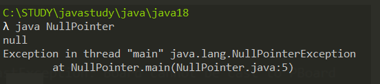class NullPointer { public static void main(String[] args) { String str = null; System.out.println(str); // null 출력 int len = str.length(); // Exception! } }