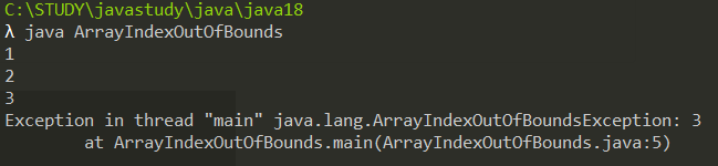 class ArrayIndexOutOfBounds { public static void main(String[] args) { int[] arr = {1, 2, 3}; for(int i = 0; i < 4; i++) System.out.println(arr[i]); } }