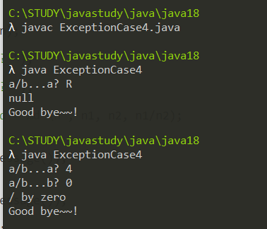 import java.util.Scanner; import java.util.InputMismatchException; class ExceptionCase4{ public static void main(String[] args){ Scanner kb = new Scanner(System.in); try{ System.out.print("a/b...a? "); int n1 = kb.nextInt(); System.out.print("a/b...b? "); int n2 = kb.nextInt(); System.out.printf("%d / %d = %d \n", n1, n2, n1/n2); } catch(ArithmeticException e){ System.out.println(e.getMessage()); } catch(InputMismatchException e){ System.out.println(e.getMessage()); } System.out.println("Good bye~~!"); } }