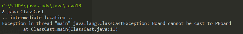 class Board { } class PBoard extends Board { } class ClassCast { public static void main(String[] args) { Board pbd1 = new PBoard(); PBoard pbd2 = (PBoard)pbd1; // OK! System.out.println(".. intermediate location .. "); Board ebd1 = new Board(); PBoard ebd2 = (PBoard)ebd1; // Exception! } }