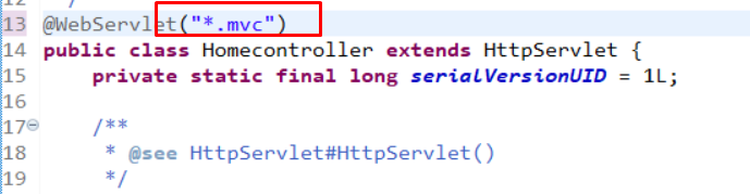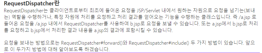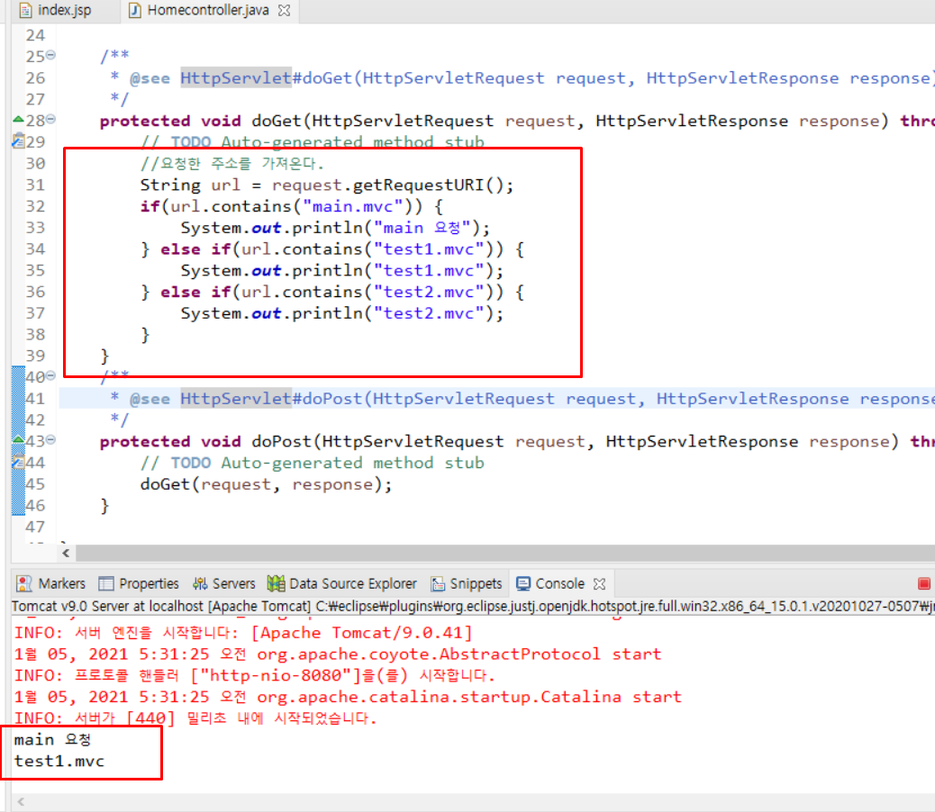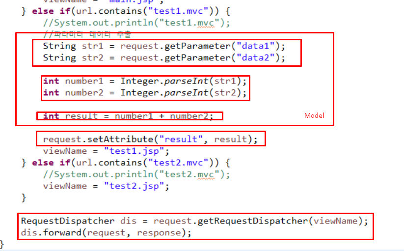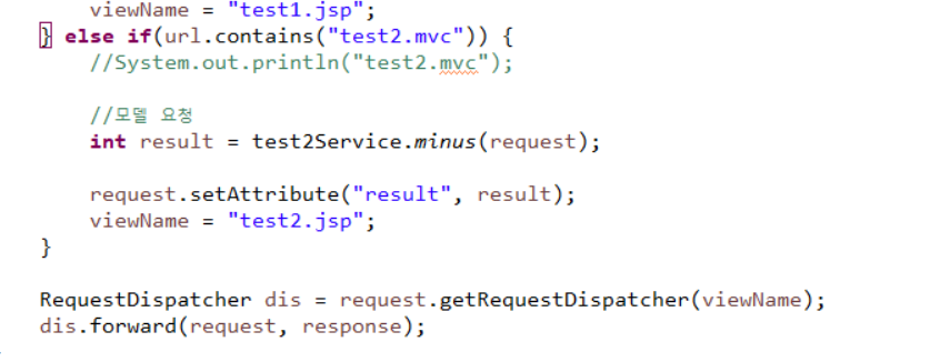 출처 : https://dololak.tistory.com/502 protected void doGet(HttpServletRequest request, HttpServletResponse response) throws ServletException, IOException { // TODO Auto-generated method stub //요청한 주소를 가져온다. String url = request.getRequestURI(); String viewName = null; if(url.contains("main.mvc")) { //System.out.println("main 요청"); viewName = "main.jsp"; } else if(url.contains("test1.mvc")) { //System.out.println("test1.mvc"); //파라미터 데이터 추출 String str1 = request.getParameter("data1"); String str2 = request.getParameter("data2"); int number1 = Integer.parseInt(str1); int number2 = Integer.parseInt(str2); int result = number1 + number2; request.setAttribute("result", result); viewName = "test1.jsp"; } else if(url.contains("test2.mvc")) { //System.out.println("test2.mvc"); viewName = "test2.jsp"; } RequestDispatcher dis = request.getRequestDispatcher(viewName); dis.forward(request, response); }