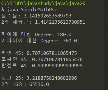 class SimpleMathUse { public static void main(String[] args) { System.out.println("원주율: " + Math.PI); System.out.println("2의 제곱근: " + Math.sqrt(2)); System.out.println(); System.out.println("파이에 대한 Degree: " + Math.toDegrees(Math.PI)); System.out.println("2 파이에 대한 Degree: " + Math.toDegrees(2.0 * Math.PI)); System.out.println(); double radian45 = Math.toRadians(45); // 라디안으로의 변환! System.out.println("싸인 45: " + Math.sin(radian45)); System.out.println("코싸인 45: " + Math.cos(radian45)); System.out.println("탄젠트 45: " + Math.tan(radian45)); System.out.println(); System.out.println("로그 25: " + Math.log(25)); System.out.println("2의 16승: "+ Math.pow(2, 16)); } }