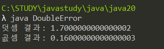class DoubleError{ public static void main(String[] args){ double d1 = 1.6; double d2 = 0.1; System.out.println("덧셈 결과: " + (d1 + d2)); System.out.println("곲셈 결과: " + (d1 * d2)); } }