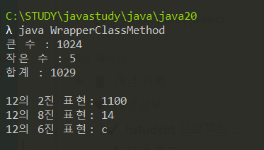 class WrapperClassMethod{ public static void main(String[] args){ //클래스 메소드를 통한 인스턴스 생성 방법 두 가지 Integer n1 = Integer.valueOf(5); // 숫자 기반 Integer 인스턴스 생성 Integer n2 = Integer.valueOf("1024"); //문자 기반 Integer 인스턴스 생성 //대소 비교와 합을 계산하는 클래스 메소드 System.out.println("큰 수 : " + Integer.max(n1,n2)); System.out.println("작은 수 : " + Integer.min(n1,n2)); System.out.println("합계 : " + Integer.sum(n1,n2)); System.out.println(); //정수에 대한 2진, 8진, 16진수 표현 결과를 반환하는 클래스 메소드 System.out.println("12의 2진 표현: " + Integer.toBinaryString(12)); System.out.println("12의 8진 표현: " + Integer.toOctalString(12)); System.out.println("12의 6진 표현: " + Integer.toHexString(12)); } }