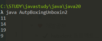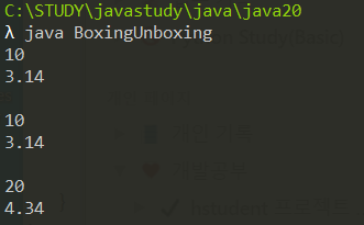 class AutoBoxingUnboxing{ public static void main(String[] args){ Integer iObj = 10; //오토 박싱 진행 Double dObj = 3.14; //오토 박싱 진행 System.out.println(iObj); System.out.println(dObj); System.out.println(); int num1 = iObj; double num2 = dObj; System.out.println(num1); System.out.println(num2); } }