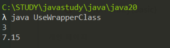class UseWrapperClass { public static void showData(Object obj) { System.out.println(obj); } public static void main(String[] args) { Integer iInst = new Integer(3); //정수 3을 감싸는 래퍼 인스턴스 생성 showData(iInst); showData(new Double(7.15)); //7.15를 감싸는 래퍼 인스턴스 생성 및 전달 } }