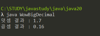 import java.math.BigDecimal; class WowBigDecimal{ public static void main(String[] args){ BigDecimal d1 = new BigDecimal("1.6"); BigDecimal d2 = new BigDecimal("0.1"); System.out.println("덧셈 결과 : " + d1.add(d2)); System.out.println("곱셈 결과 : " + d1.multiply(d2)); } }