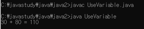 class UseVariable { public static void main(String[] args){ int num1; // 변수 num1의 선언 num1 = 30; //변수 num1에 10을 저장 int num2 = 80; // 변수 num2에 20을 저장 int num3 = num1 + num2; //두 변수 값을 대상으로 덧셈 System.out.println(num1 + " + " + num2 + " = " + num3); } }결과