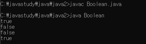 class Boolean{ public static void main(String[] args) { boolean b1 = true; boolean b2 = false; System.out.println(b1); //b1 이 지닌 값 출력 System.out.println(b2); int num1 = 10; int num2 = 20; System.out.println(num1>num2); System.out.println(num1<num2); } }결과