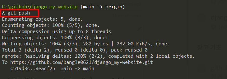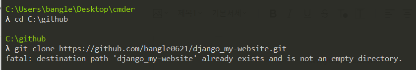 일단 cd C:\github 를 입력어로 github 폴더로 이동한 뒤 git clone 내 깃 url 입력
