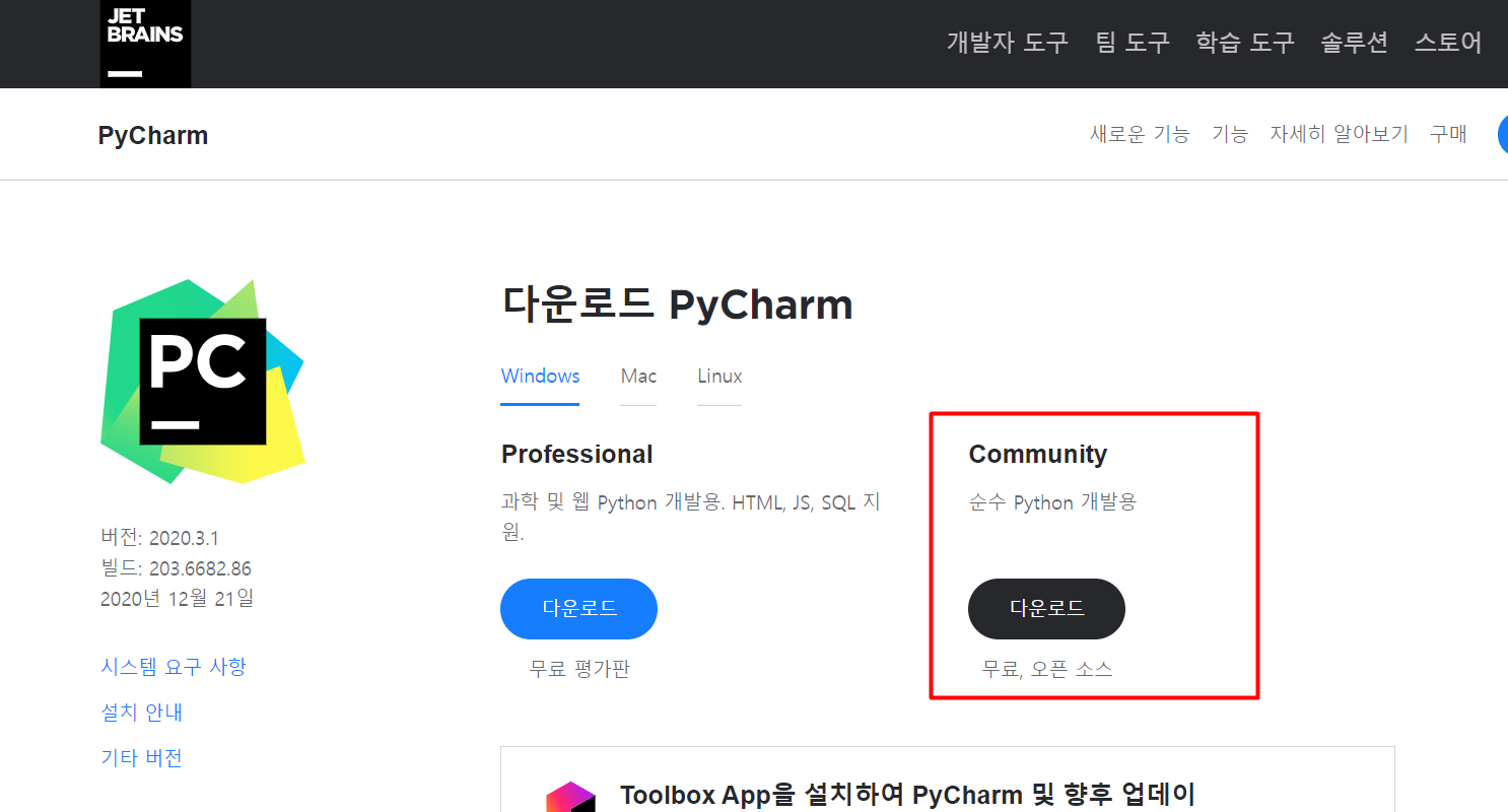 www.jetbrains.com/ko-kr/pycharm/download/#section=windows